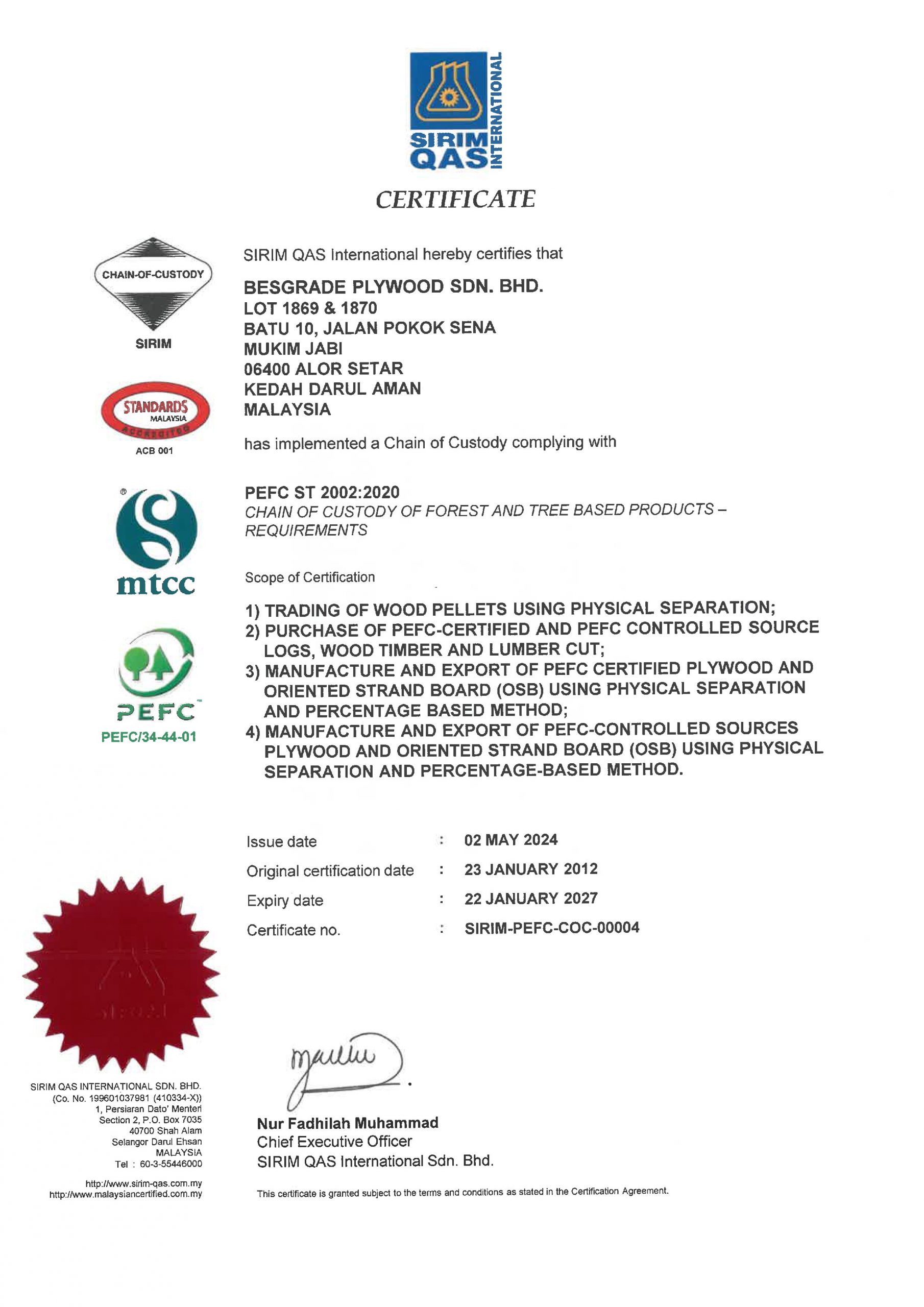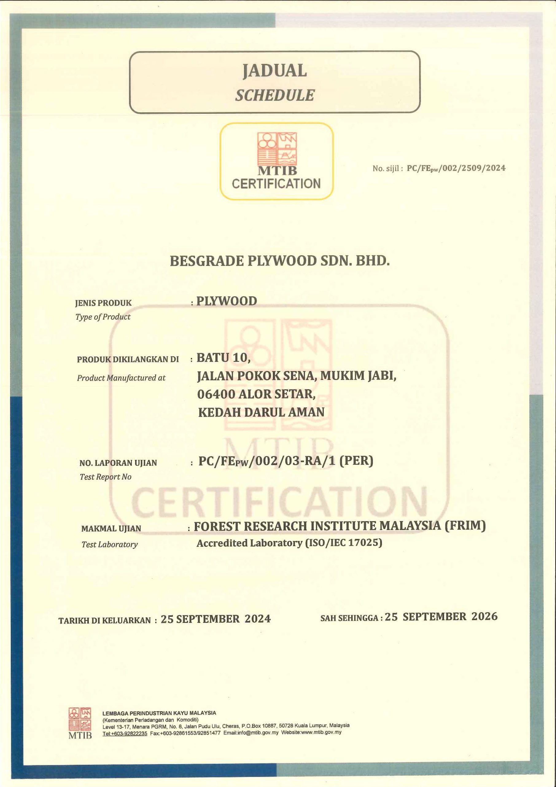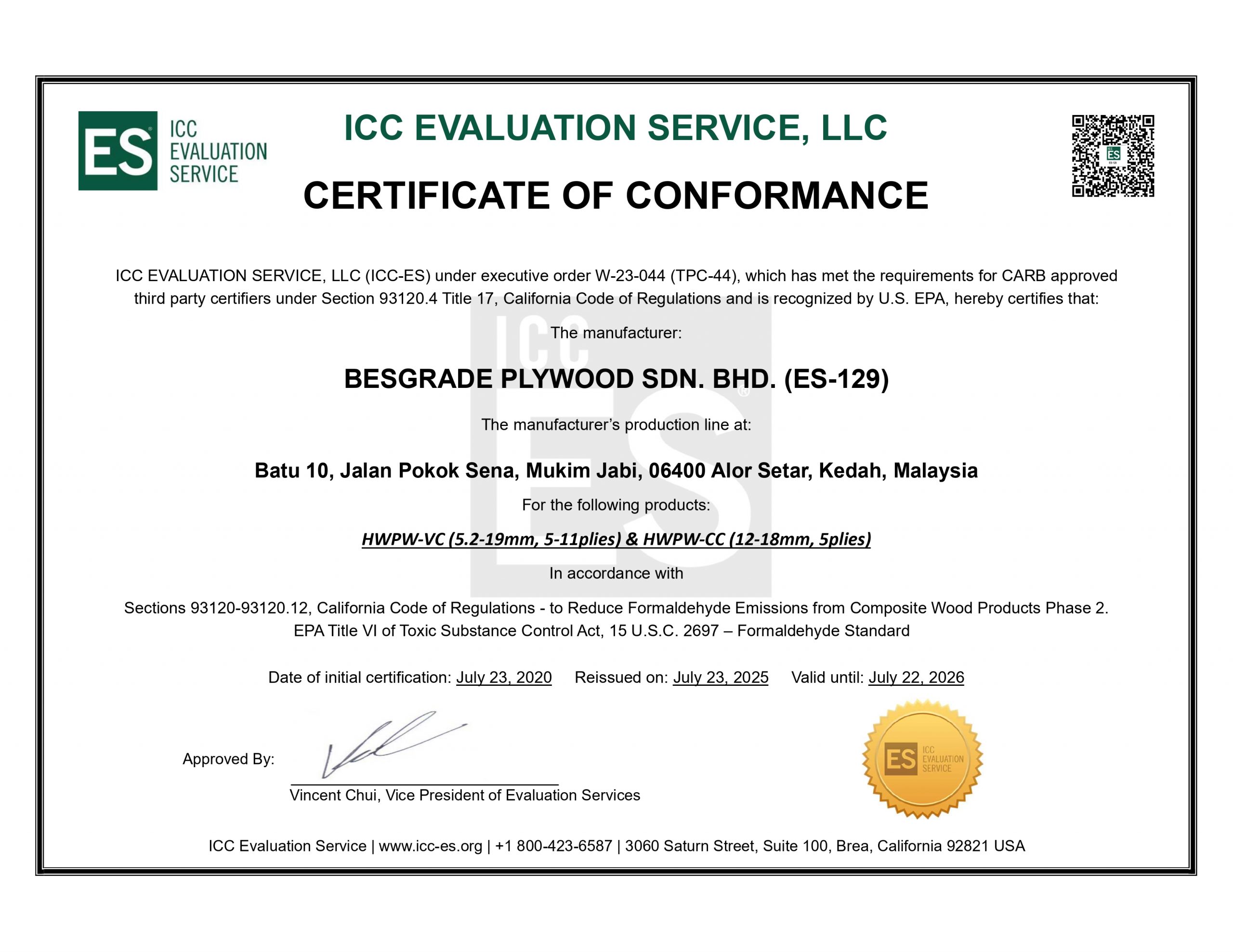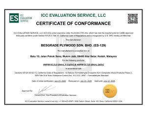 This certification ensures that the plywood formaldehyde emission of Besgrade Products’ plywood for export to USA is in compliance with the CARB standard to protect plywood end users from exposure to formaldehyde pollution which is a health hazard.
