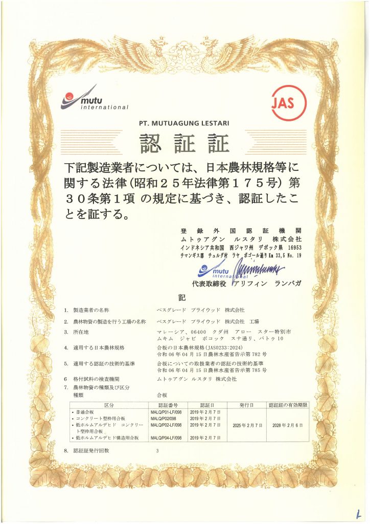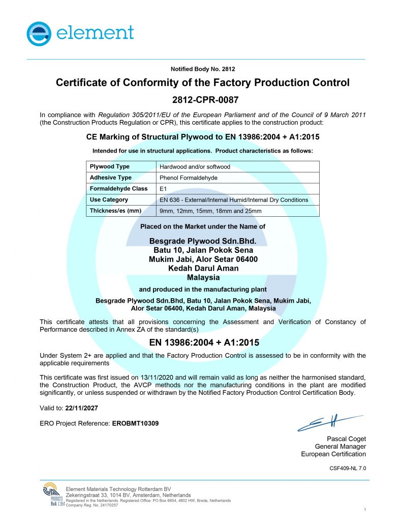 This certification ensures that the plywood formaldehyde emission of Besgrade Products’ plywood for export to USA is in compliance with the CARB standard to protect plywood end users from exposure to formaldehyde pollution which is a health hazard.